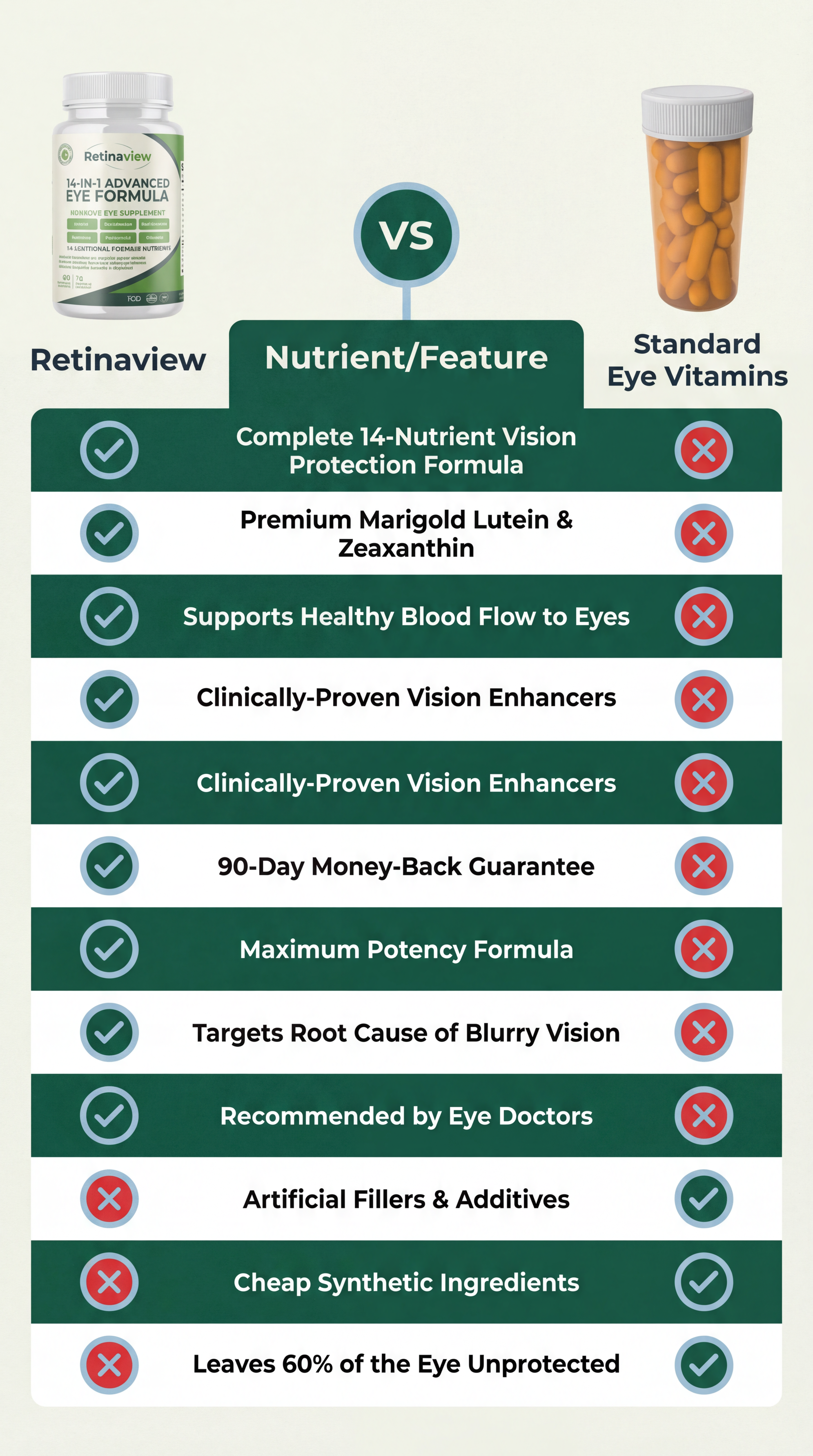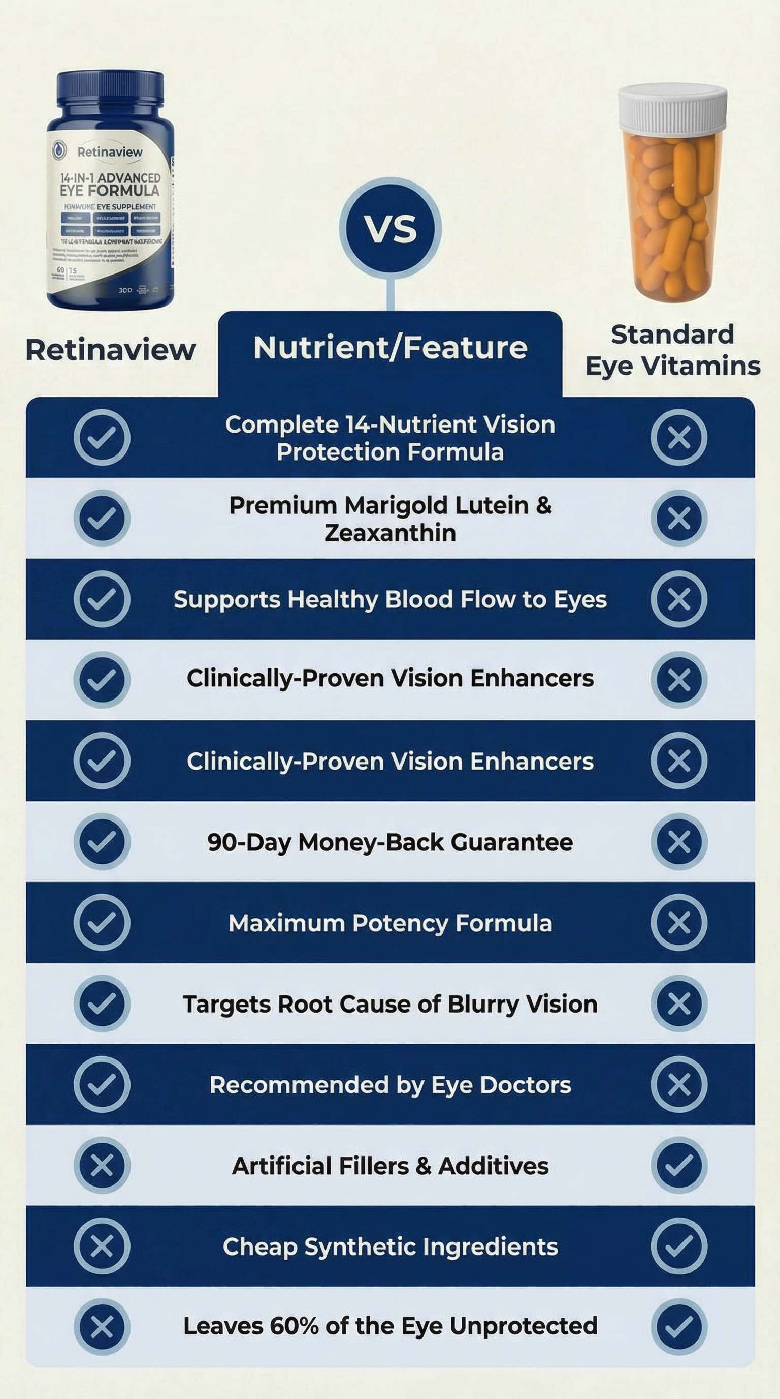 Total Spectrum Protection. Most standard eye supplements on the market only cover about 60% of your vision's needs. RetinaRenew is different because we include all three critical carotenoids (Lutein, Zeaxanthin, AND Meso-Zeaxanthin) alongside 11 other essential nutrients at clinical strength. We also feature Harvard-studied vision boosters like Saffron Extract, which many other brands leave out to save money. This is the difference between a partial formula and one that truly works.
